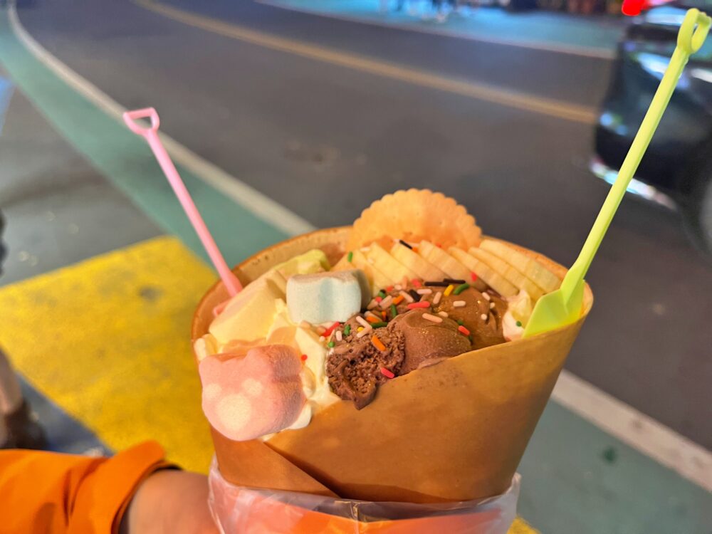 既に夕食は済ませているので、甘いスイーツを食べて、夜市の射的やゲーム、土産物を見て過ごしました。