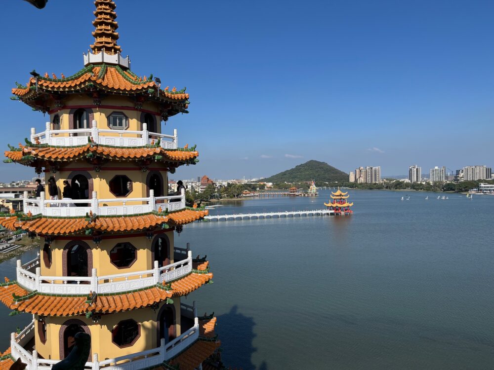 蓮池まで到着して、対岸に龍虎塔が見えています。